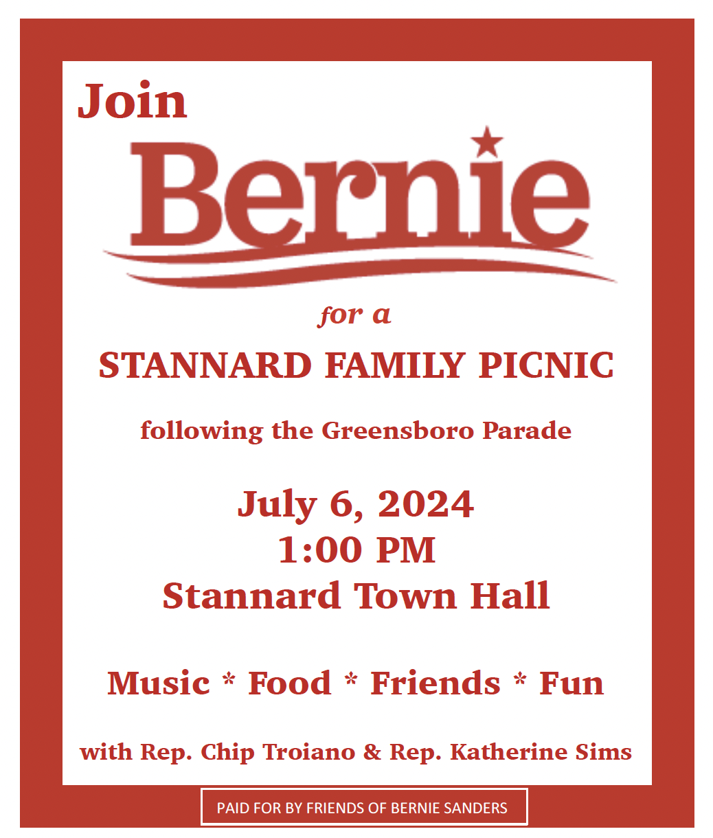 Join Senator Bernie Sanders along with Rep. Katherine Sims and Rep. Chip Troiano for a Stannard Family Picnic following the Greensboro Parade with music, food, friends and fun.